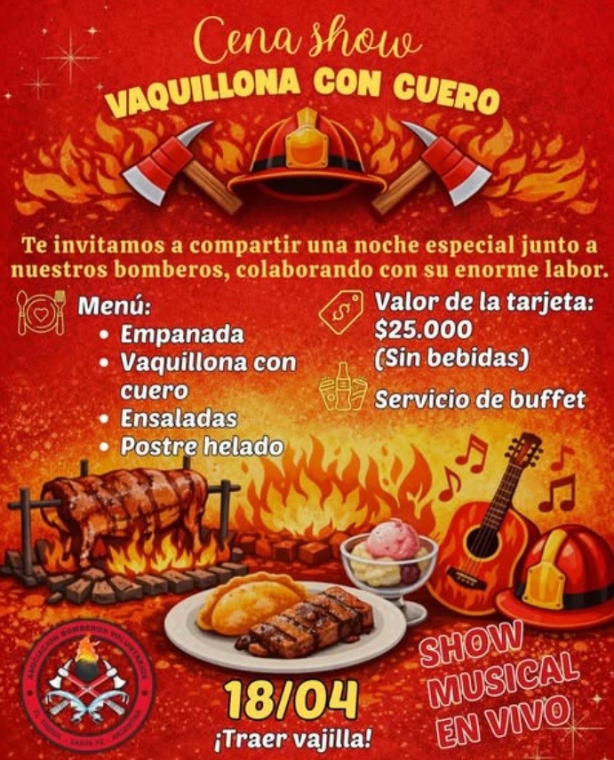 La Asociación de Bomberos Voluntarios se encuentra en plena actividad de cara al mes de abril. Con el fin de fortalecer el equipamiento de la institución y mejorar la respuesta ante siniestros en la zona, han organizado una cena benéfica que contará con la colaboración desinteresada de la comunidad.