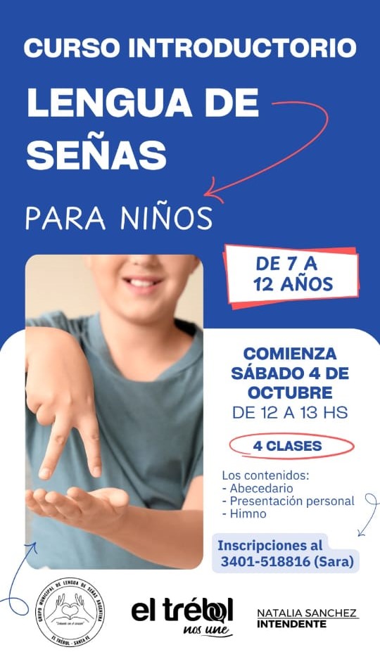 Este año, se han abierto las inscripciones para el curso introductorio de Lengua de Señas para niños de 7 a 12 años, con contenidos que incluyen el abecedario, presentación personal y el himno. Las clases comenzarán el sábado 4 de octubre de 12 a 13 hs y constarán de 4 encuentros. Para inscripciones, contactar a Sara al 3401-518816.
