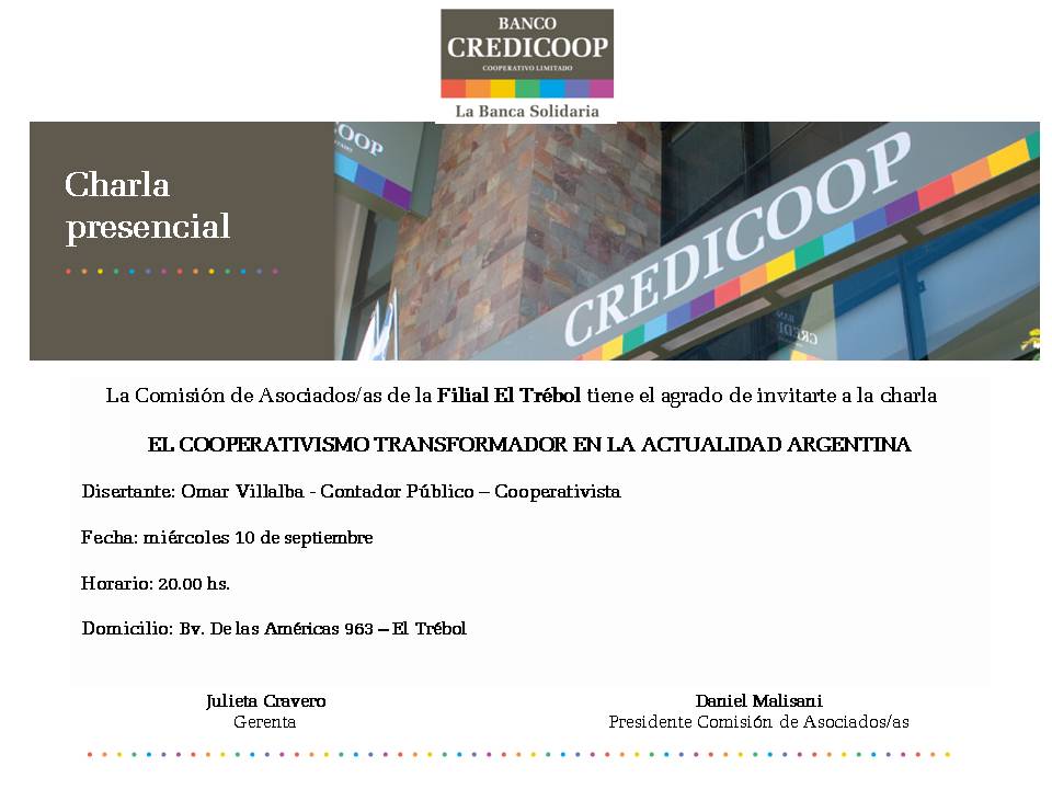 La Comisión de Asociados y Asociadas de la Filial El Trébol del Banco Credicoop ha organizado una charla abierta a la comunidad para abordar un tema de gran relevancia en el contexto actual: «El cooperativismo transformador en la actualidad argentina». El evento busca reflexionar sobre el papel de las cooperativas como una herramienta clave para el desarrollo social y económico.