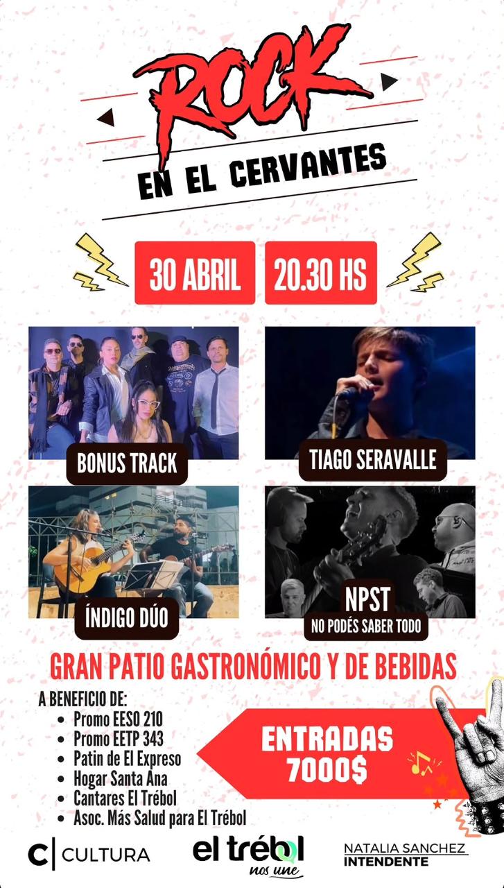 El emblemático espacio se transformará en un «gran patio» para albergar el evento Rock en el Cervantes. La jornada contará con un despliegue artístico de primer nivel con la actuación de Bonus Track, Tiago Seravalle, Índigo Dúo y la banda NPST (No Podés Saber Todo). El repertorio promete un recorrido por los mejores clásicos del pop y el rock, brindando un escenario ideal para el talento local.