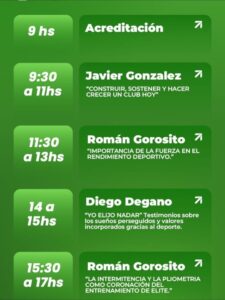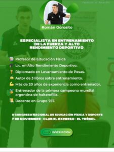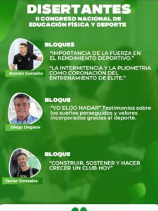 - Prof. Román Gorosito: Abordará la importancia del entrenamiento de la fuerza en el rendimiento deportivo, complementando con los temas de “La intermitencia y la pliometría como coronación del entrenamiento de élite”.
