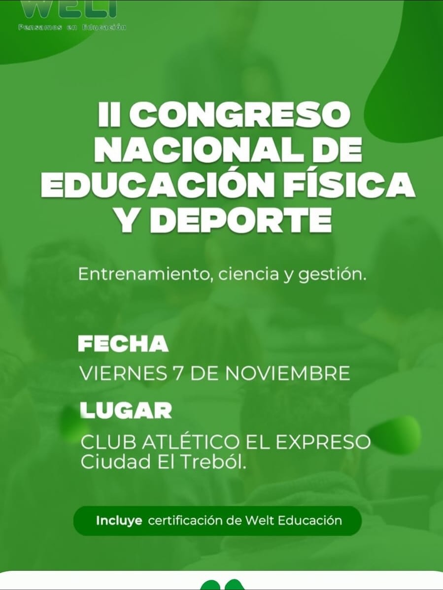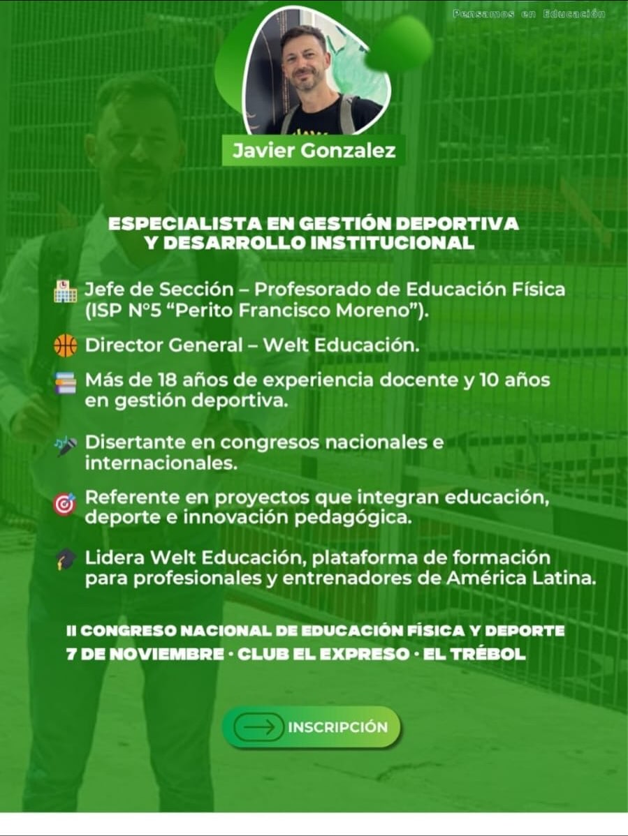 Bajo el lema «Entrenamiento, Ciencia y Gestión», la jornada de formación se llevará a cabo el próximo viernes 7 de noviembre en las instalaciones del Club Atlético El Expreso. El evento es organizado en conjunto con Welt Educación, reafirmando el compromiso con la capacitación y el desarrollo deportivo en la región.