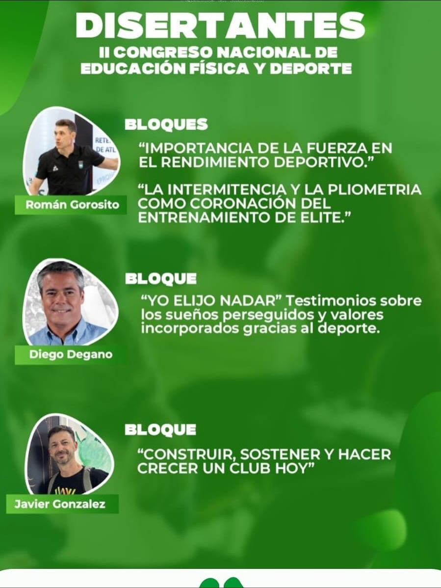 - Prof. Román Gorosito: Abordará la importancia del entrenamiento de la fuerza en el rendimiento deportivo, complementando con los temas de “La intermitencia y la pliometría como coronación del entrenamiento de élite”.