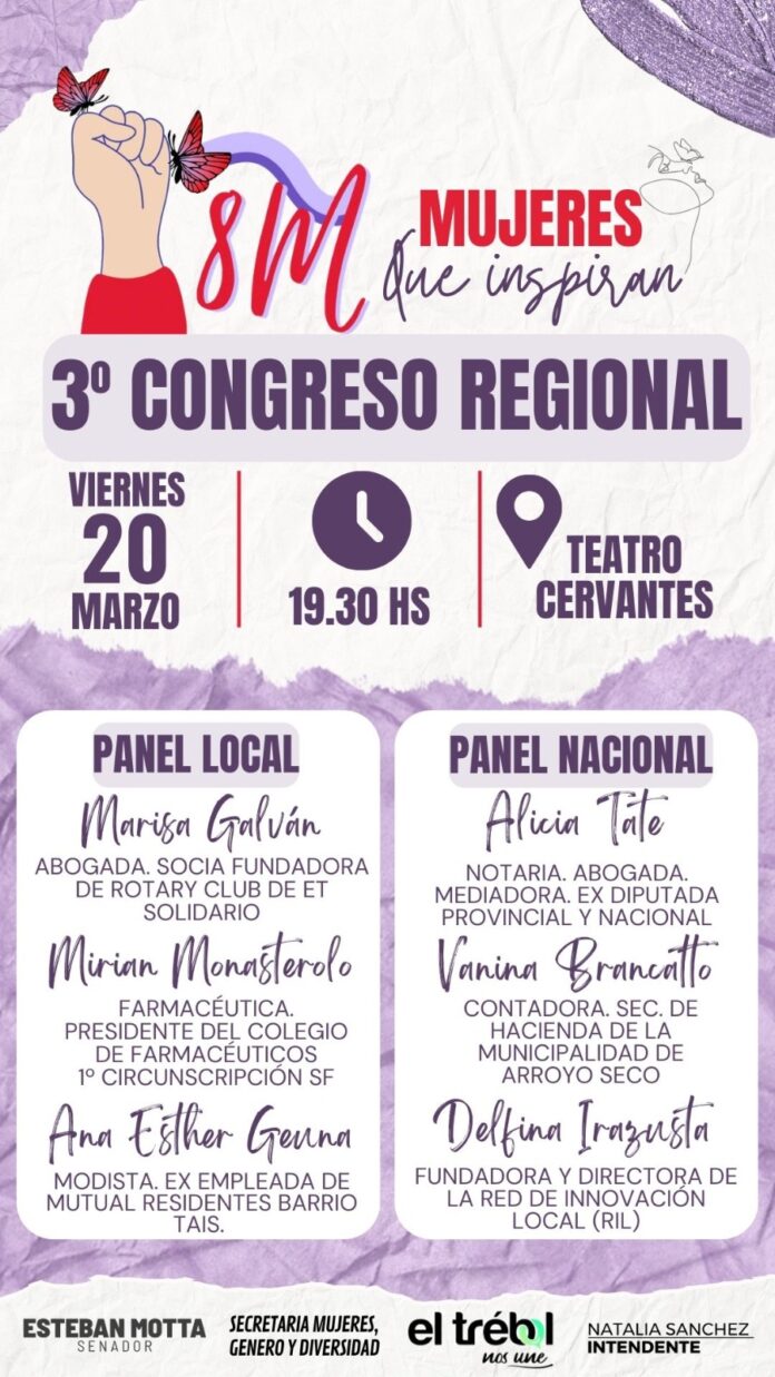 En una nueva iniciativa para visibilizar el liderazgo y el impacto de la mujer en la sociedad, la ciudad de El Trébol recibirá la tercera edición del Congreso Regional “Mujeres que Inspiran”. La cita tendrá lugar este viernes 20 de marzo a partir de las 19:30 horas en las instalaciones del Teatro Cervantes.