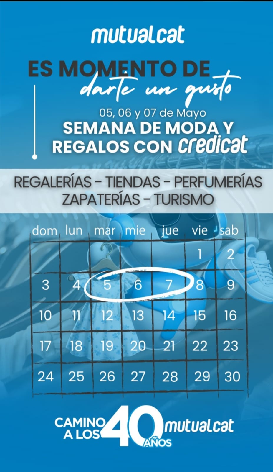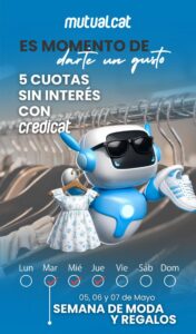 El éxito de Credicat no se detiene. En el marco del camino a los 40 años de vida de Mutual CAT, la institución prepara un mes de mayo cargado de sorpresas. Como adelanto, ya se ha confirmado la «Semana de Moda y Regalos».