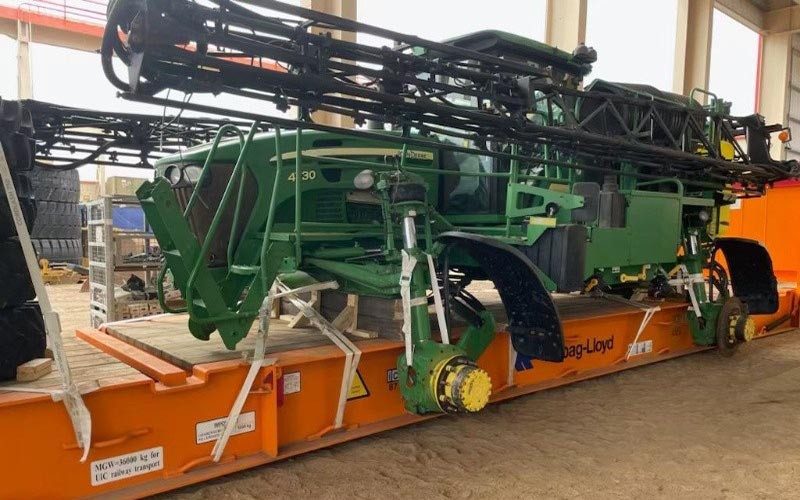 La pulverizadora preparada para partir hacia Argentina.